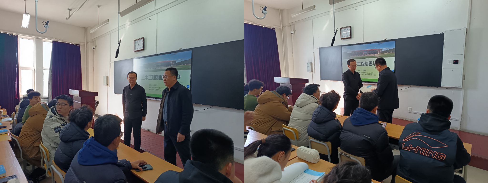 学院领导班子成员及各系主任分别听取了道路与桥梁工程系武鹏飞讲授的《土木工程制图与CAD》、冯佃芝讲授的《铁道工程》、陈雷讲授的《土木工程施工》;给排水科学与工程系张镭讲授的《给排水工程仪表与控制》、董艳荣讲授的《水分析化学》;智能建造系袁野讲授的《土木工程试验与检测》;建筑工程系闫雨讲授的《土木工程施工》。