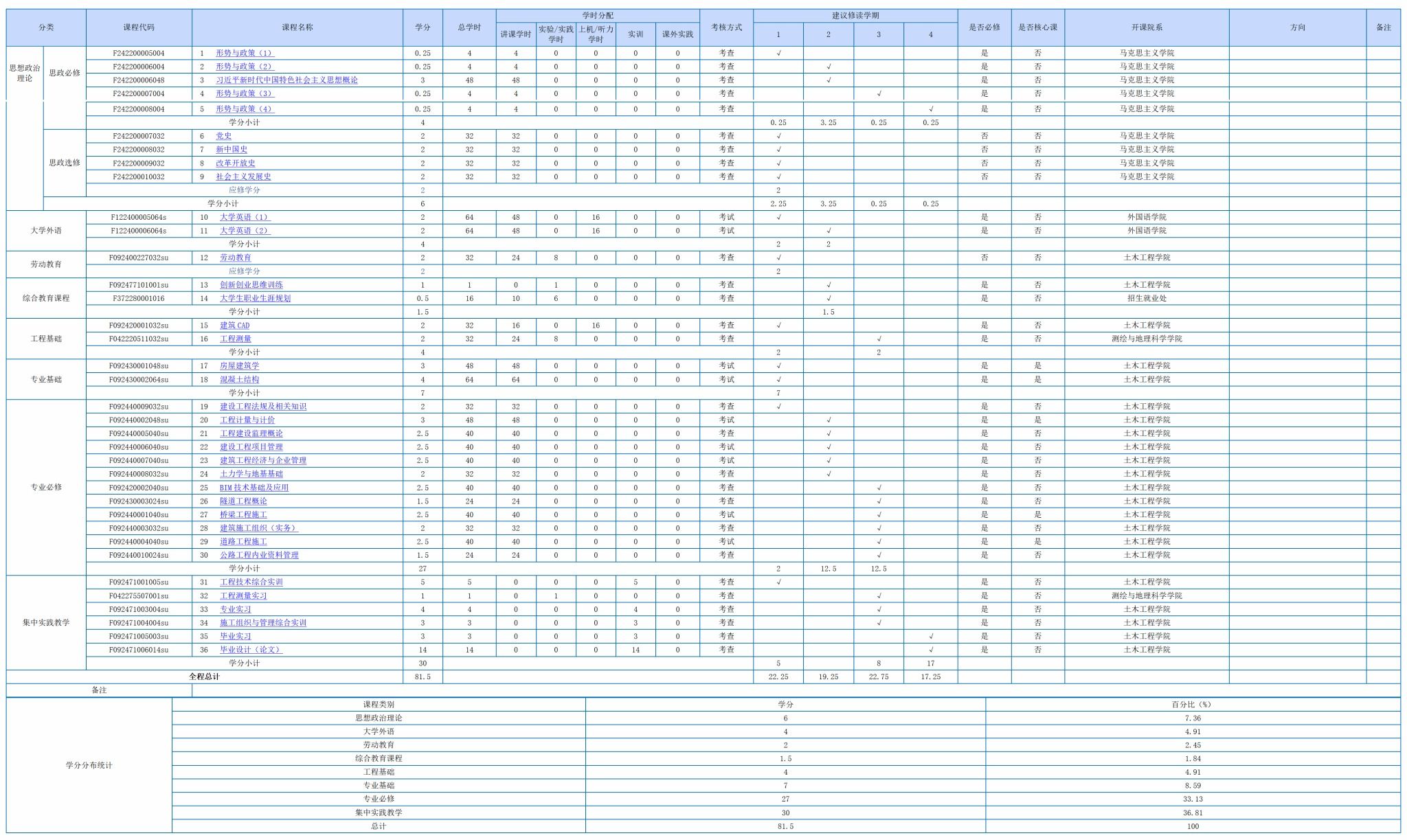 工程技术综合实训、施工组织与管理综合实训、工程测量实习、专业实习、毕业实习、毕业设计(论文)。